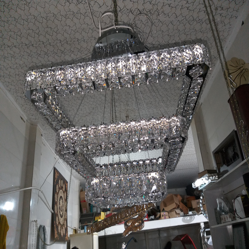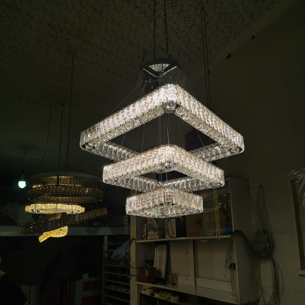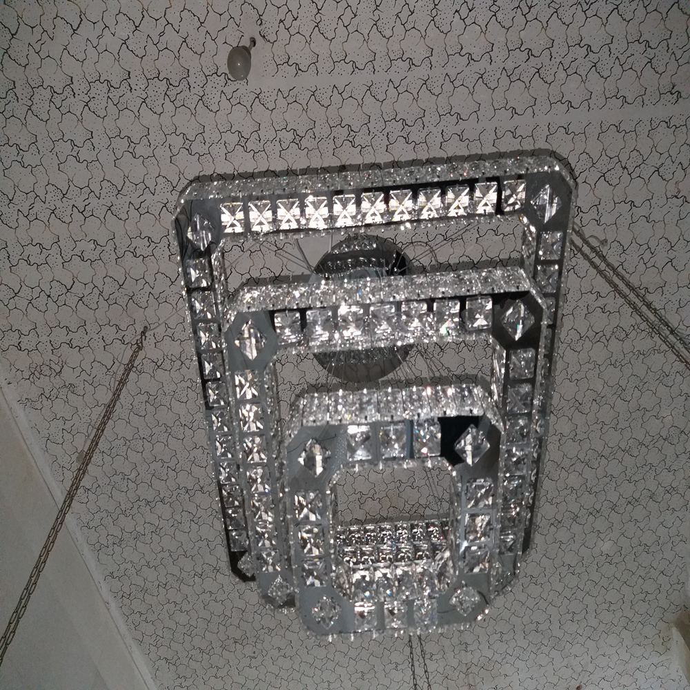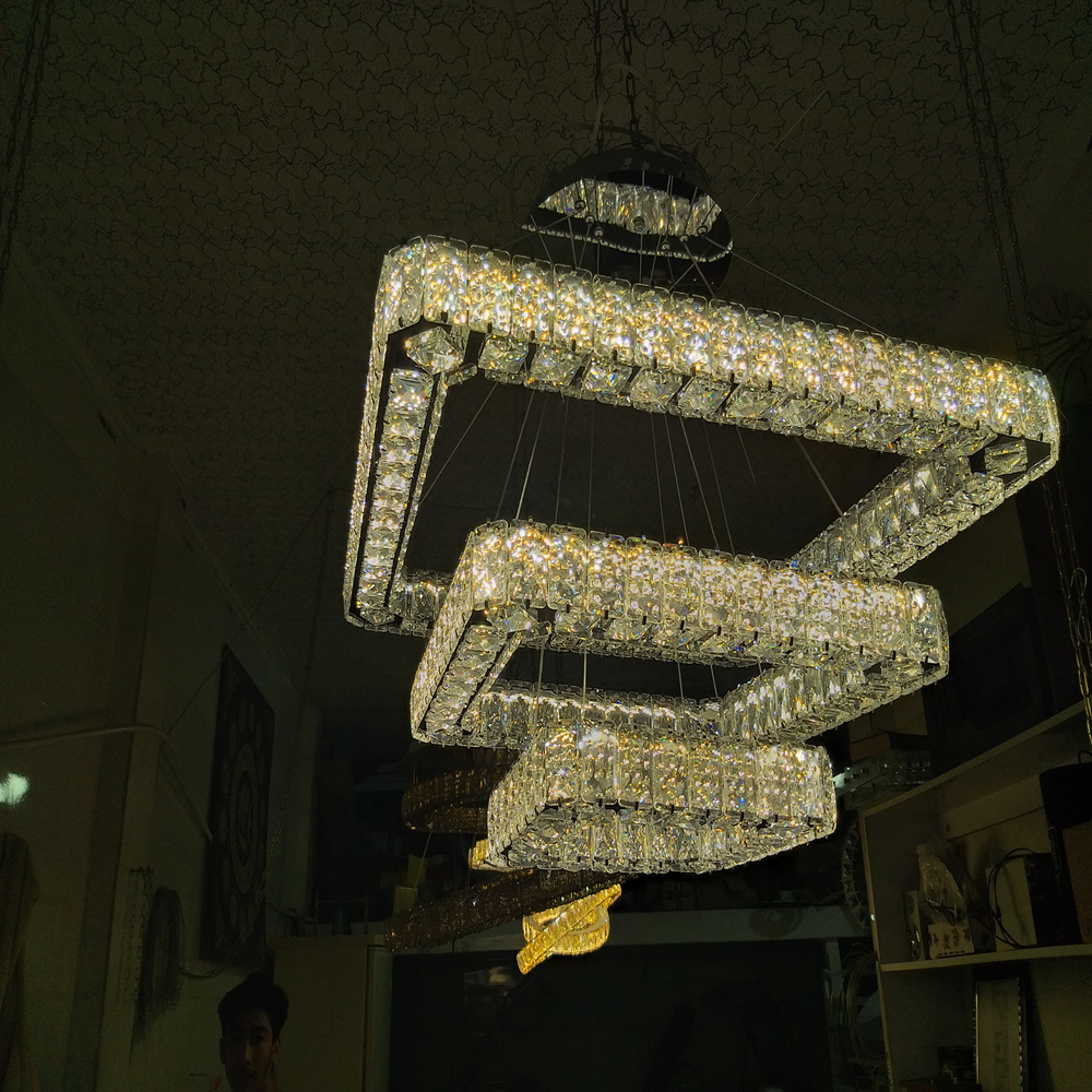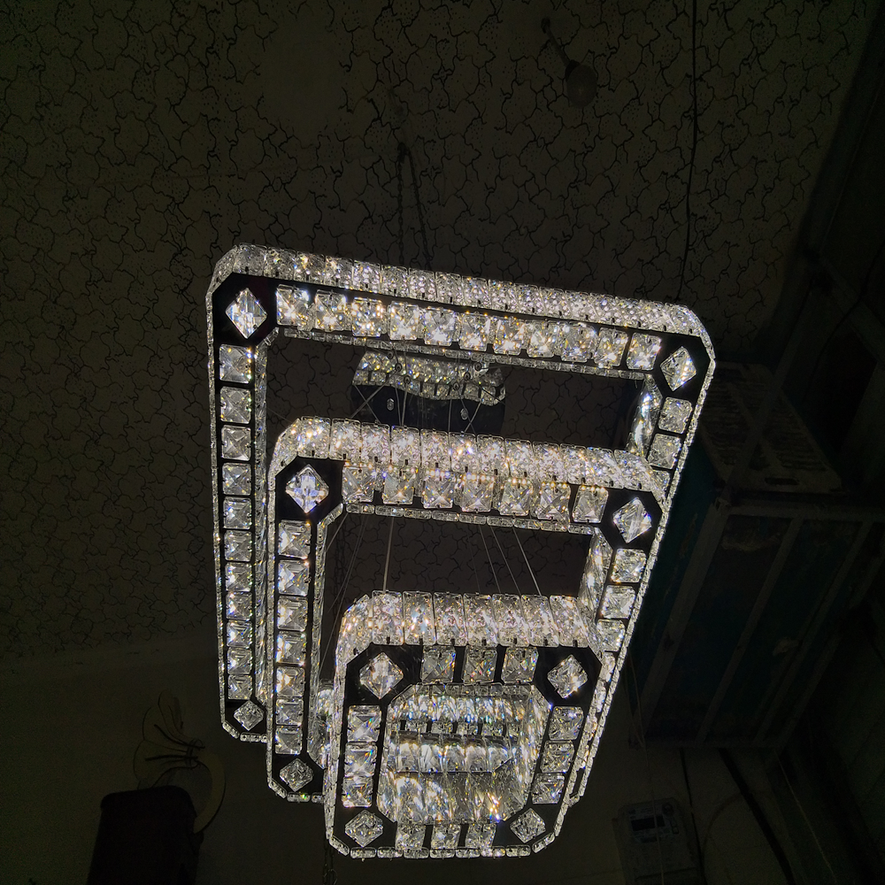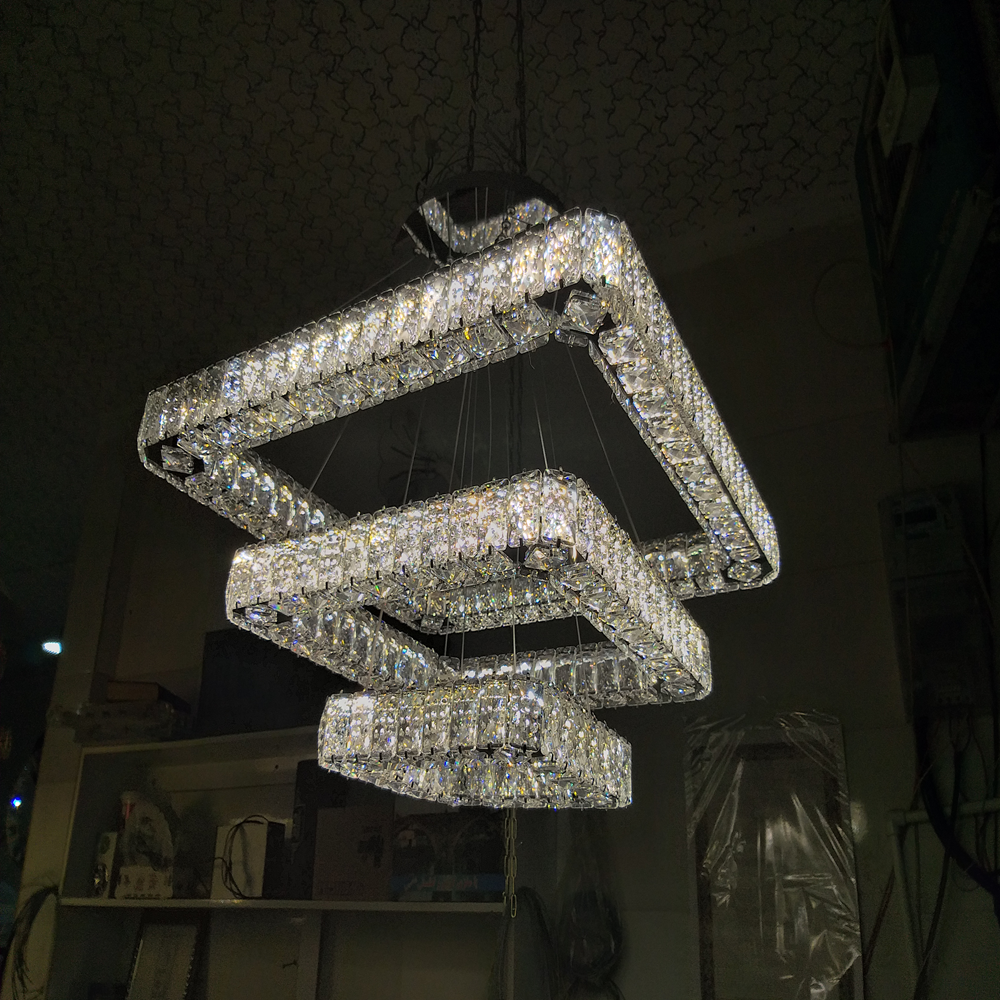 آویز سه طبقه مربعی با سایزهای ۶۰، ۴۰ و ۲۰ سانتیمتر، یک مدل مدرن و خوشساخت برای فضاهایی مانند پذیرایی، نشیمن، اتاقهای بزرگ و محیطهای رسمی است. طراحی پلکانی مربعها، جلوهای منظم و مینیمال ایجاد میکند و کریستال سهطرفه با افزایش شکست نور، درخشندگی بیشتری به فضا میدهد و نورپردازی را چشمگیرتر میکند.